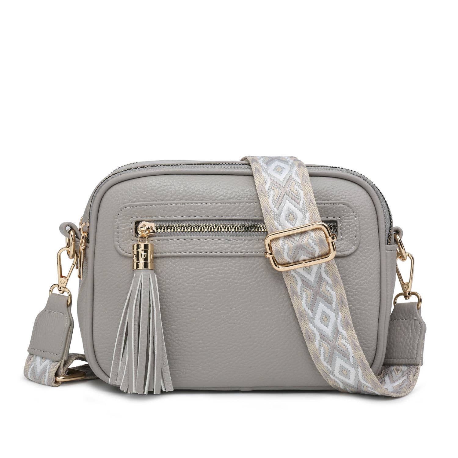Cross Body Handbag with double zip top sections, tassel details, front and back zipped pockets and adjustable wide strap .