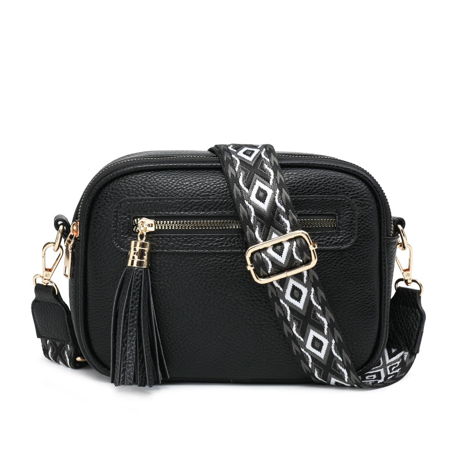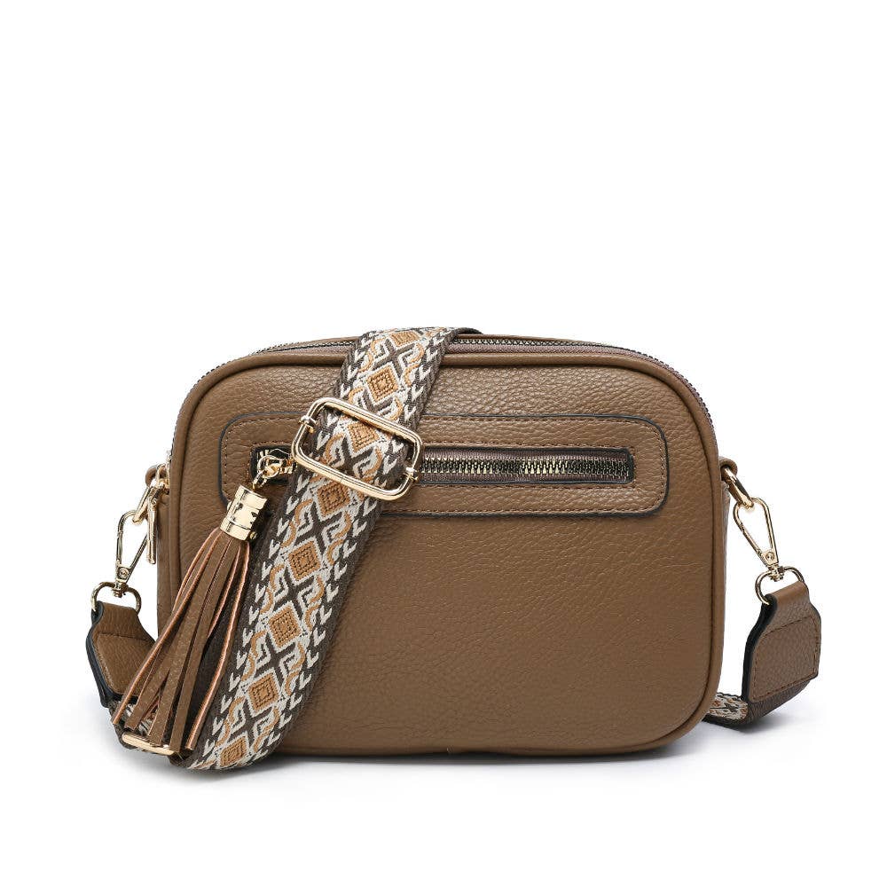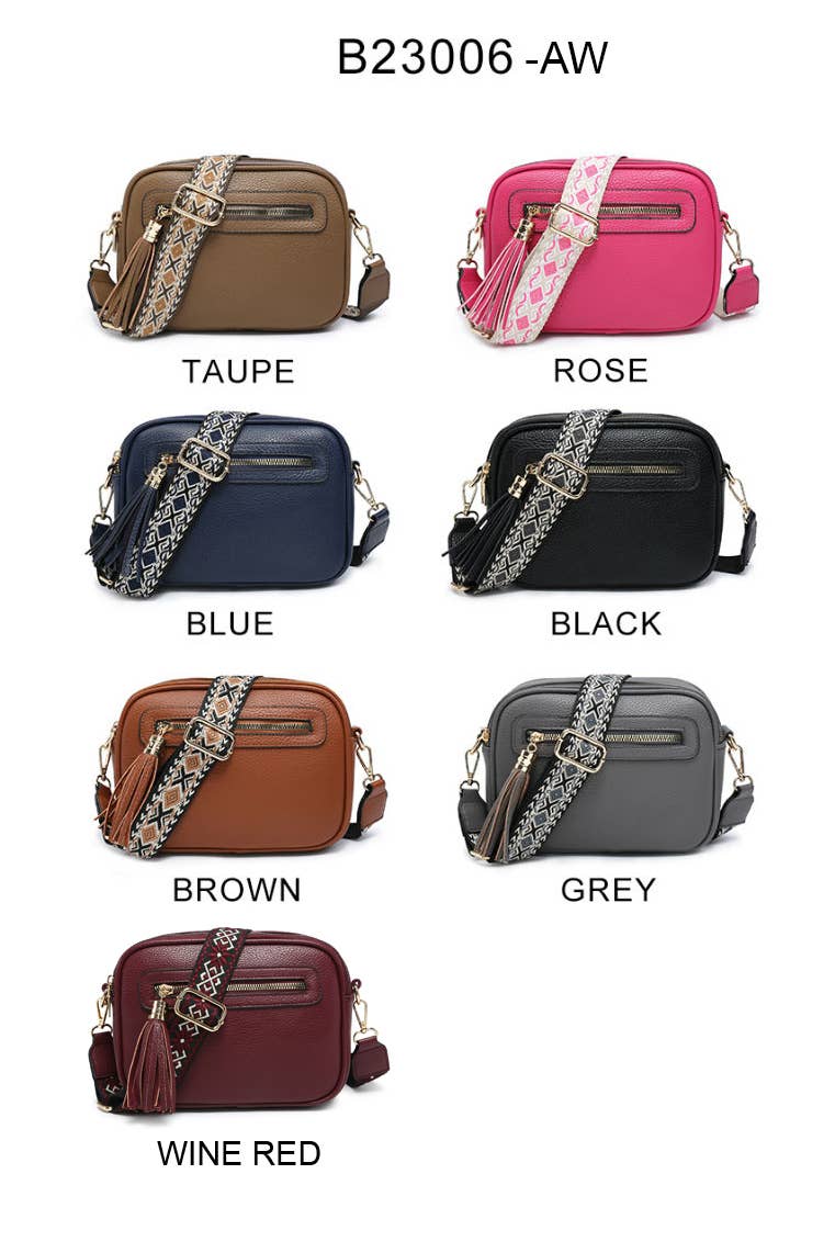 Cross Body Handbag with double zip top sections, tassel details, front and back zipped pockets and adjustable wide strap .
