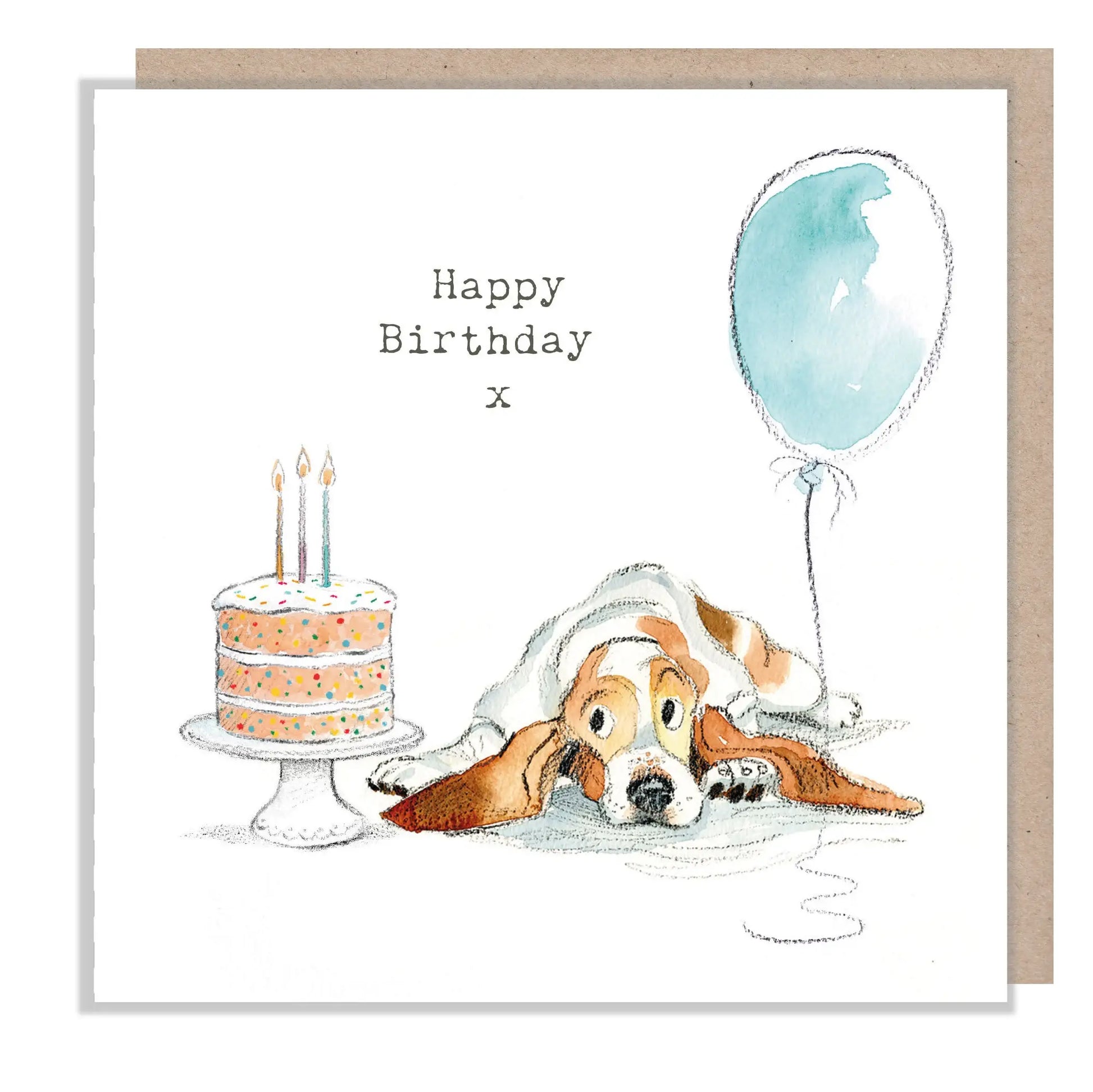Birthday Card - Happy Birthday -Bassett With Cake And Balloon